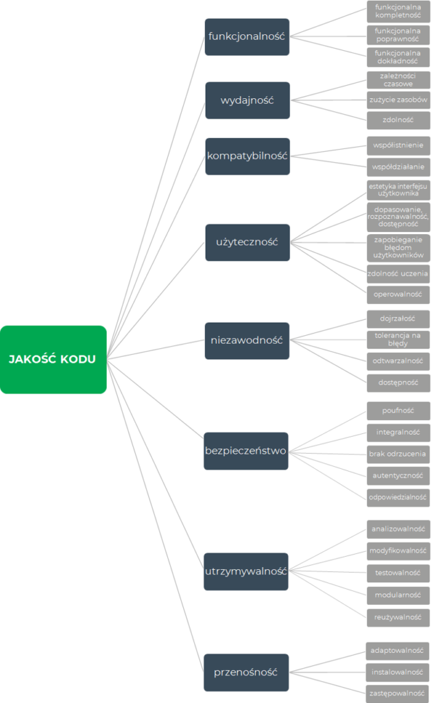 Jak można zauważyć na powyższym rysunku, jakość oprogramowania została przedstawiona jako zespół charakterystyk i pod-charakterystyk, jakie musi ono spełnić, aby mogło otrzymać status produktu wysokiej jakości.