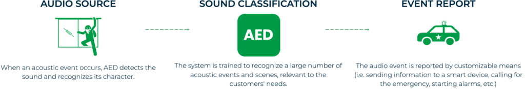 The system constantly records the sound signal, then processes it and determines whether a dangerous event has occurred. If it finds that a hazardous activity has taken place, it triggers the alarm and notifies the relevant services or persons.