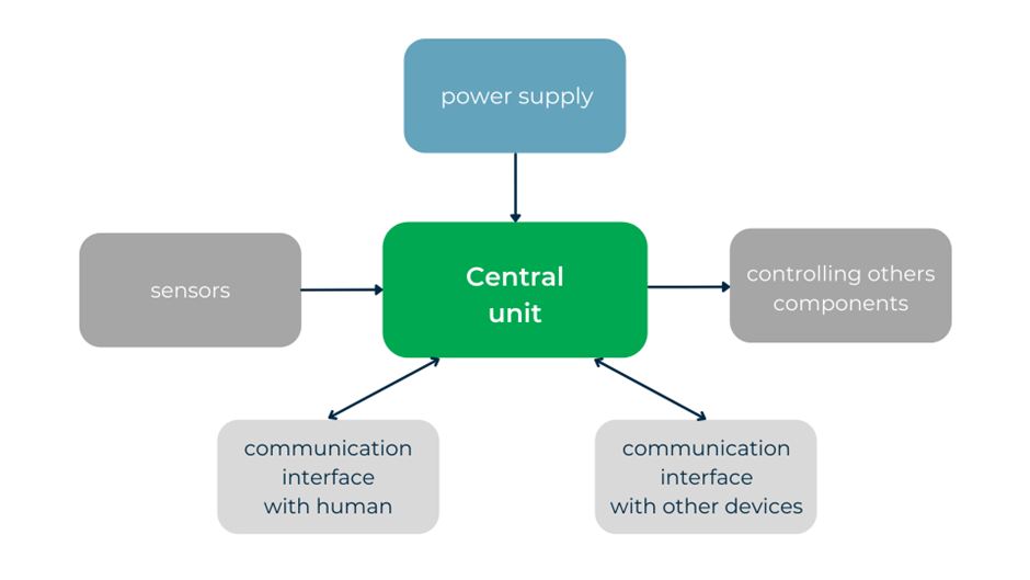 In a nutshell, a typical embedded system is a very simple device. Sensors measure size data, communication interfaces exchange the necessary data with other devices as well as with humans themselves (e.g. the display), and the power supply provides energy. On top of that, there are other modules that directly impact the operation of the entire device, such as an electromagnetic relay controller. So, in theory, it is technically a very simple device