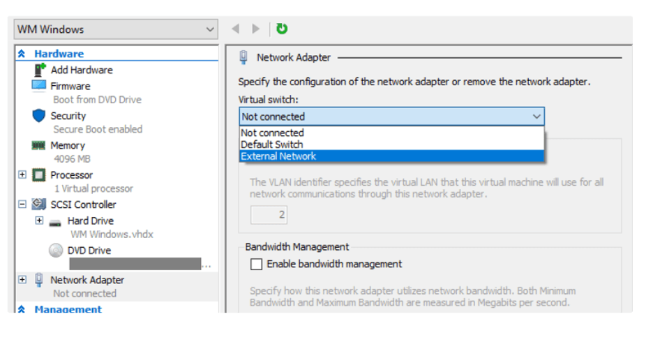 The next step is to configure network interfaces for the virtual machine. You can do it by configuring a Virtual Switch. It is the link between the physical host interface and the virtual machine interface.