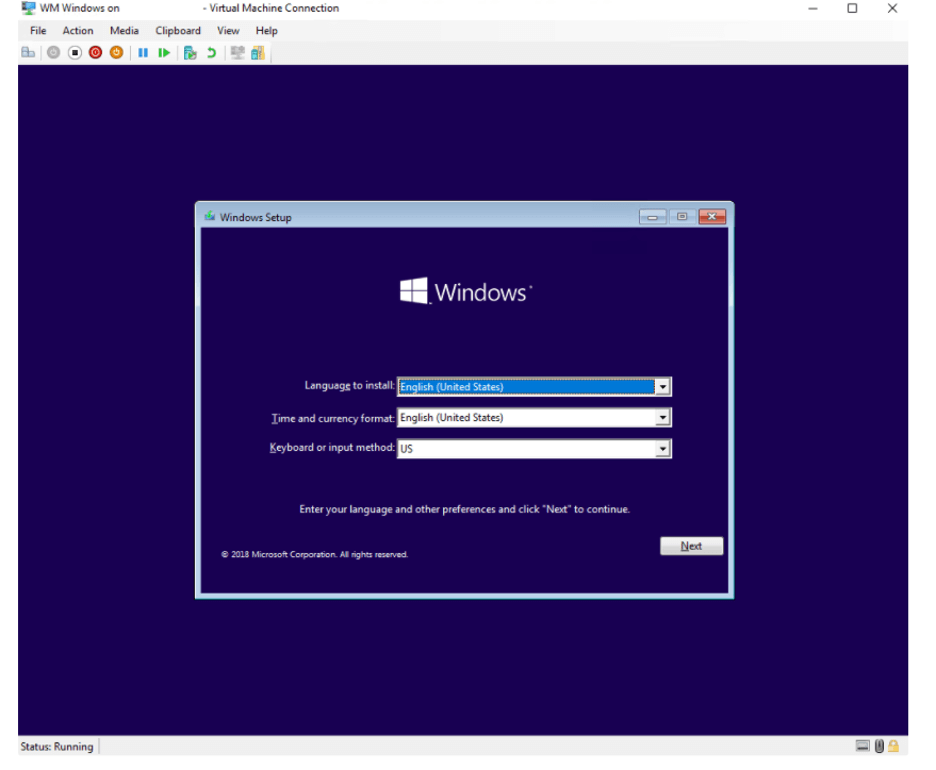 After configuring the virtual machine and connecting to the network, the only thing left to do is start your virtual machine. To do this, select it, click Connect, and you can start by selecting the Start command from the Action menu or by pressing Ctrl + S.