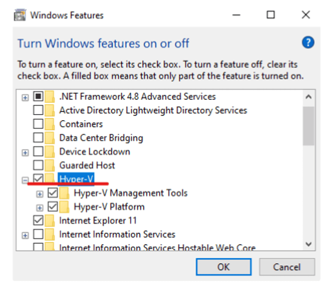 Select Control PanelAll Control Panel ItemsPrograms and Features, then click on Turn Windows Features on or off and select Hyper-V from the list of available components. The components needed to run Hyper-V will be selected automatically. Finally, confirm by clicking OK.