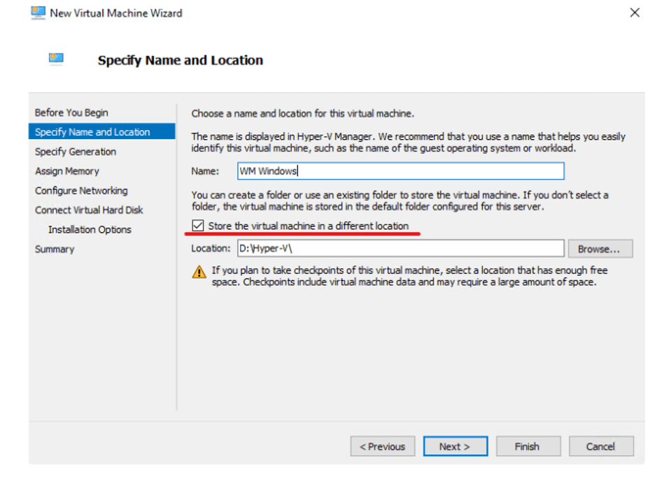 The Virtual Machine Creation Wizard will open. Confirm the first window by clicking Next. In the next window, type in the name of the virtual machine and, possibly, its location on the drive. It is good to select the Store the Virtual machine in a different location option. This will give more control over virtual machines.