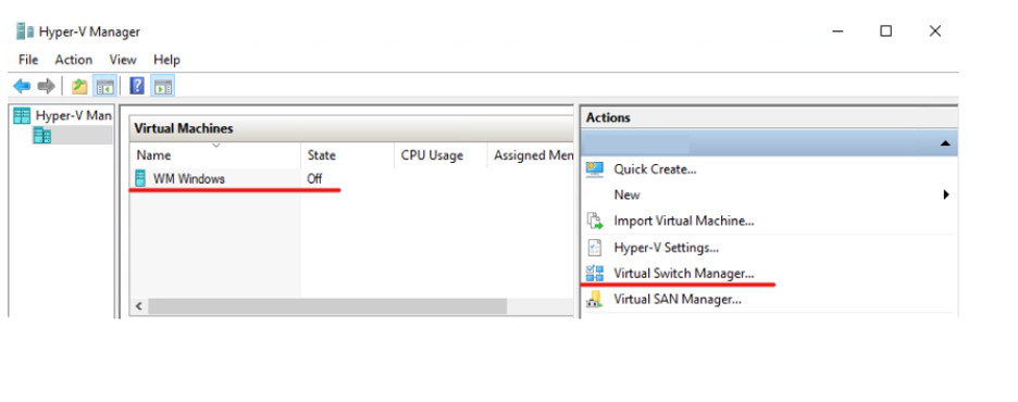 To create it click Virtual Switch Manager in the Actions panel. In the newly opened window select the New virtual Network switch option, then type in the name of the new Virtual Switch and the physical interface of the host to which it is to be connected.