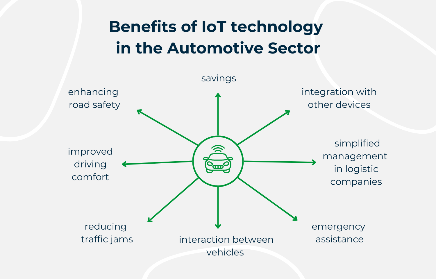 The application of IoT in the automotive industry is not just about safety or efficiency enhancement. Here, it is well worth mentioning In-Vehicle Infotainment (IVI) software, which enables the integration of internal and external systems (e.g. one’s own smartphone) to provide access to information and entertainment for drivers and passengers.
