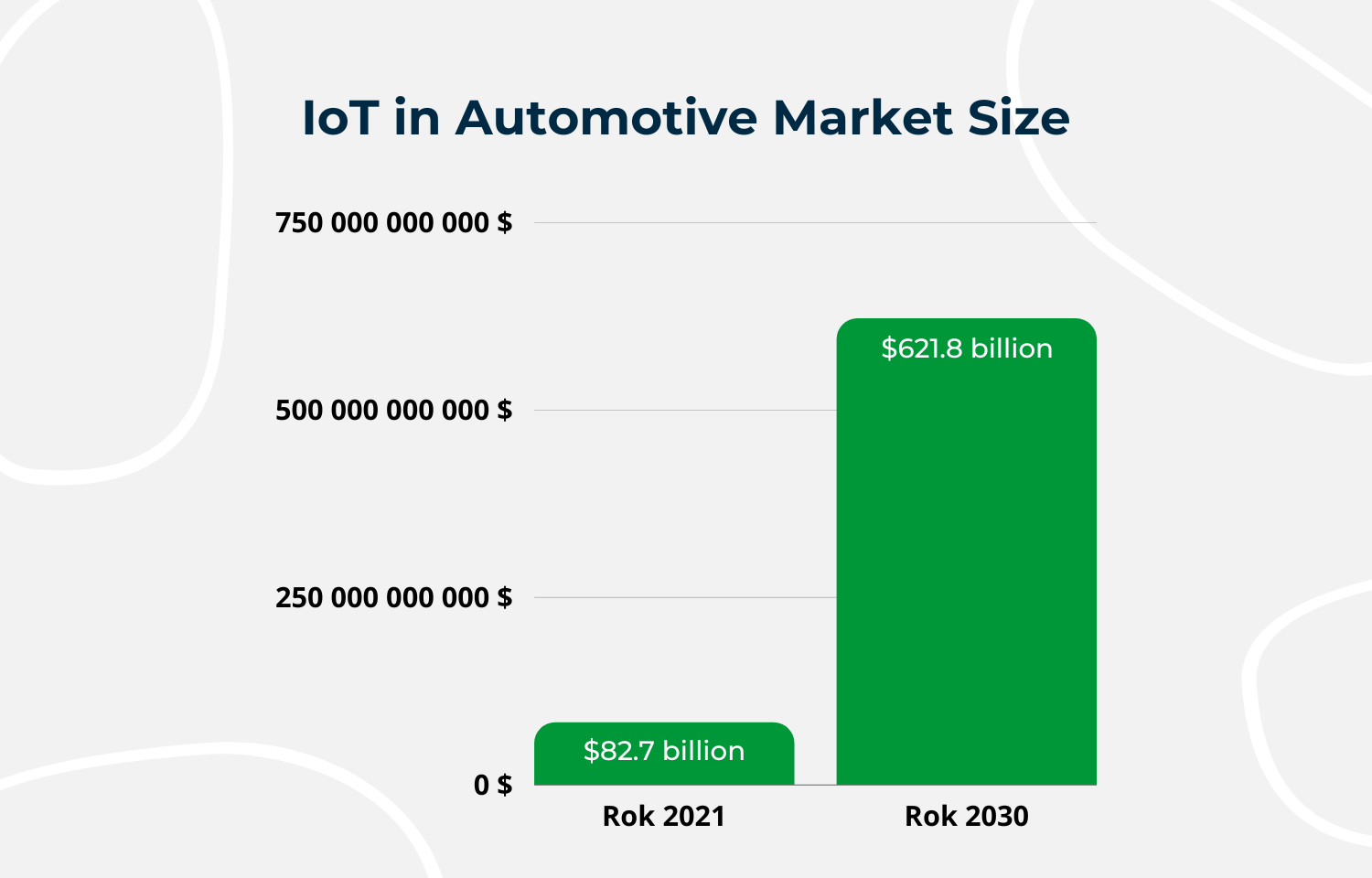 The global automotive IoT market size was worth $82.7 billion in 2021. According to Precedence Research, it is expected to reach around 621.8 billion by 2030 and drive growth at a CAGR of 25.13% over the next eight years.