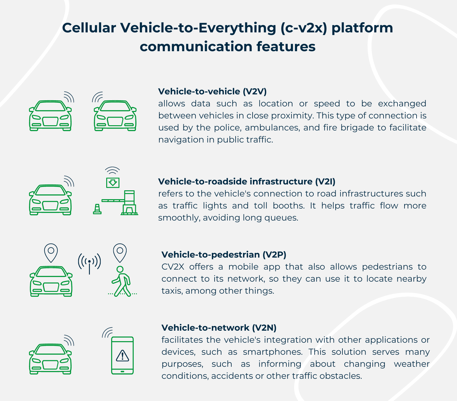 One of the most popular connectivity platforms is Cellular Vehicle-to-Everything (C-V2X). Here’s the connectivity grid and the solutions associated with it in the graphic below.